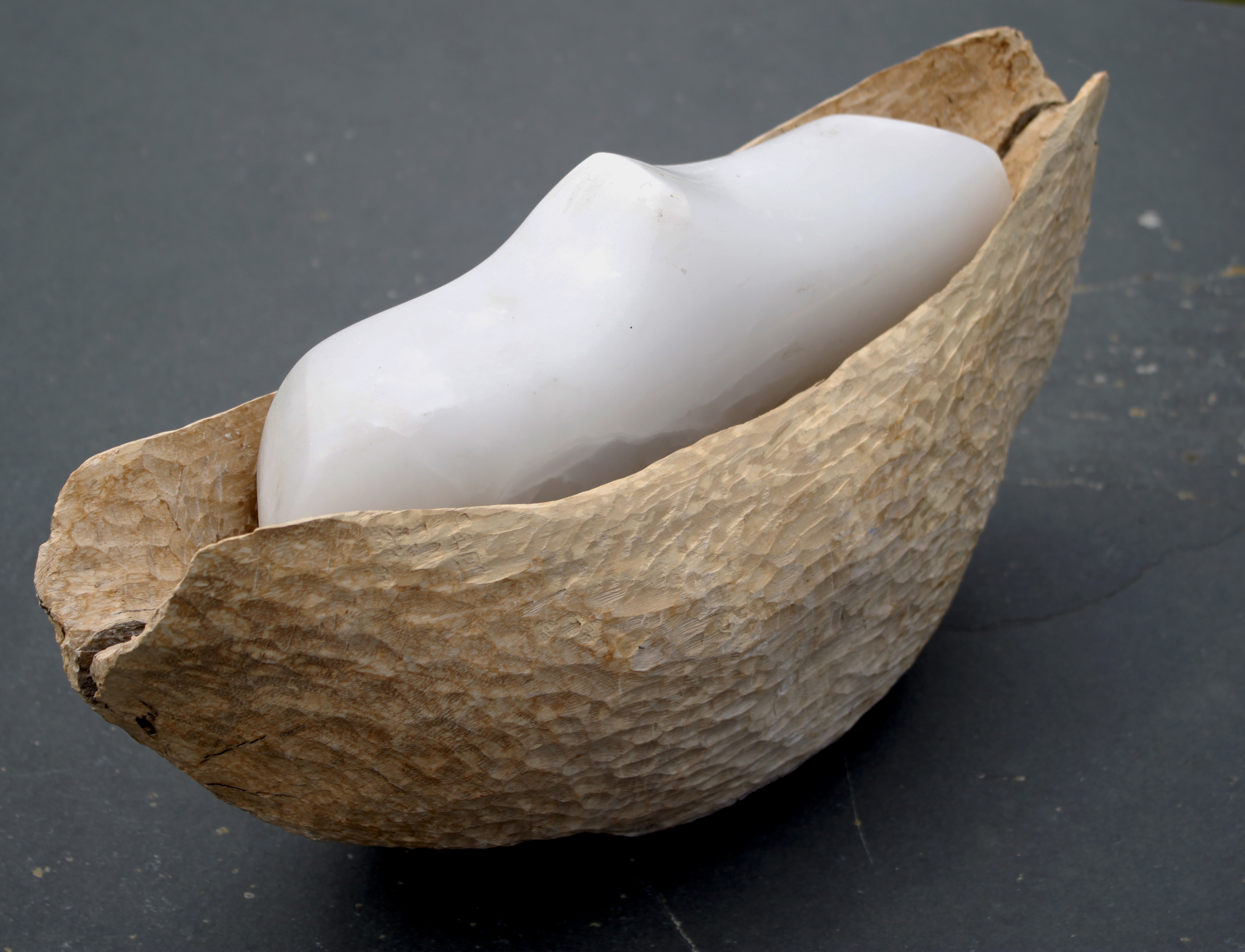 sculpture in carved wood with a carved form in blue gypsum stone sitting within the wood